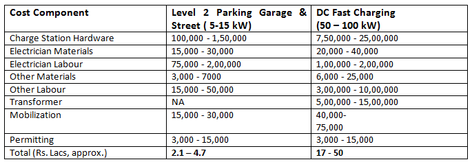 The following table was prepared based on international data on charging station expenses, but adapted to Indian conditions, with costs such as labour costs suitable adjusted. Most of these charging stations are predominantly for charging electric cars and not for smaller vehicles such as two and three wheelers.