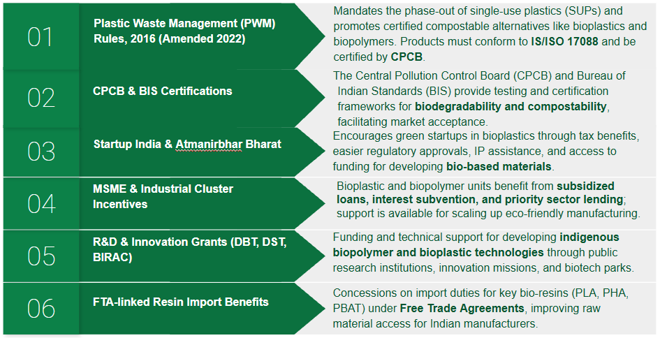 | Lack of Incentives for Brand Adoption | Many brands hesitate to switch due to cost and lack of direct consumer demand or regulatory pressure. | • Offer ESG-linked tax rebates and branding benefits for companies using bioplastics. • Mandate biopolymer usage quotas in key sectors (e.g., packaging, e-commerce, hospitality). |