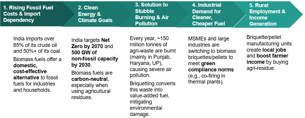 - Rising Energy Prices: Biomass fuels are 15–25% cheaper than coal and LPG on a per-unit energy basis
