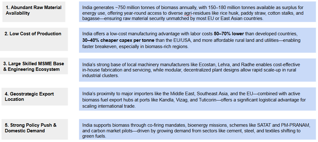 - Raw Material Advantage: India generates 150+ million tonnes/year of surplus agri-residues, ensuring year-round feedstock availability.