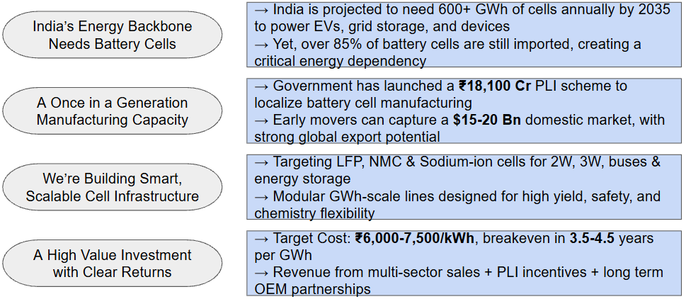 - Capitalize on the government’s ₹18,100 crore PLI scheme for Advanced Chemistry Cell (ACC) manufacturing to reduce upfront capital investment and ensure long-term financial viability.