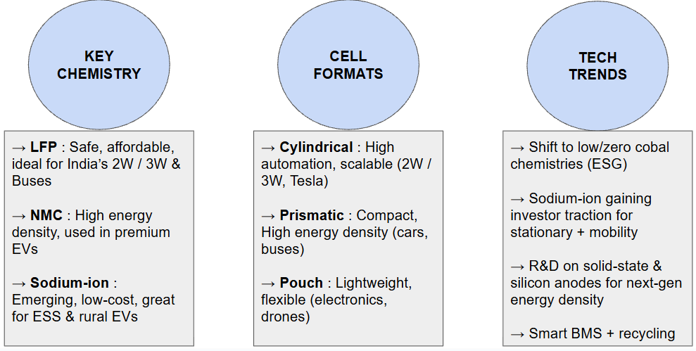 | Cylindrical | ₹350–400 Cr | Medium (~160–180 Wh/kg) | 2W, 3W, power tools | High yield, scalable |