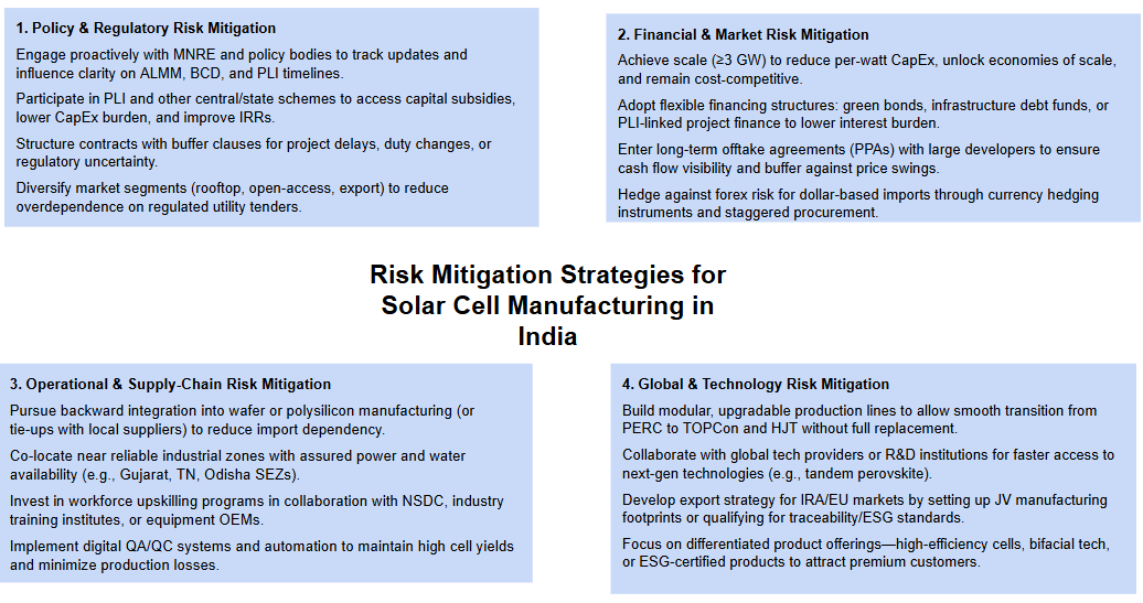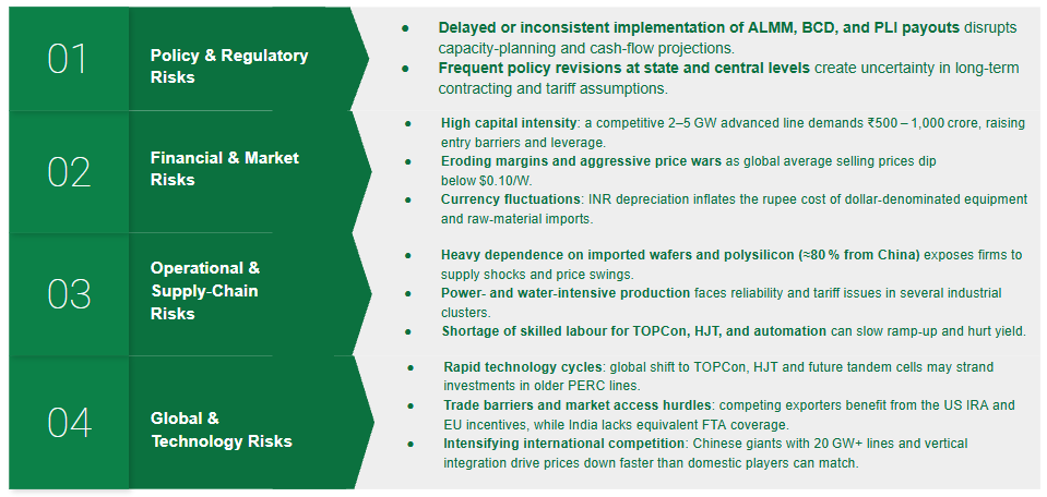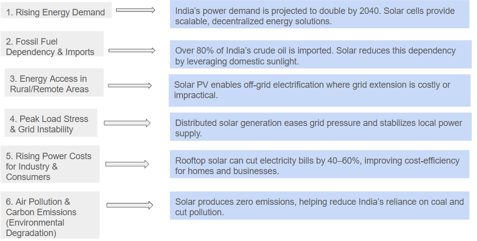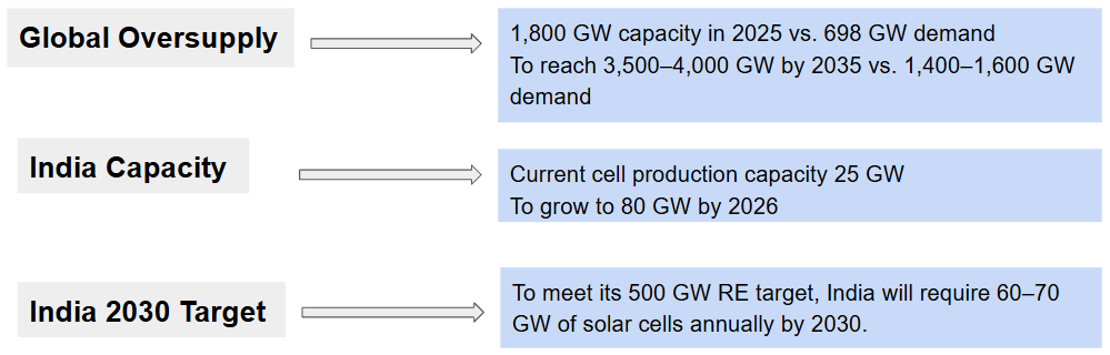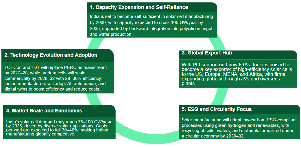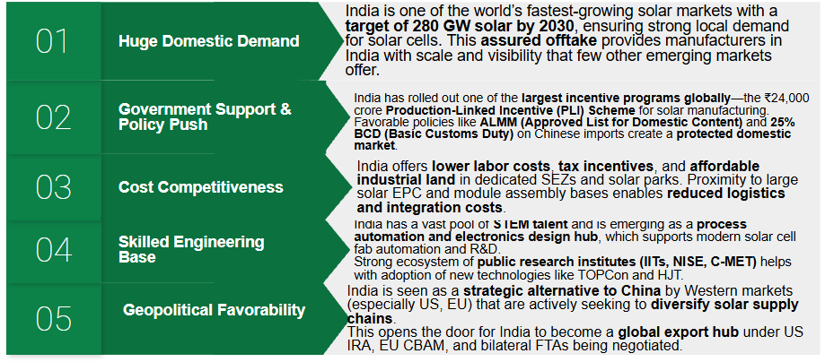 - Export & Trade Strategy – India’s China‑plus‑one positioning, green‑tech FTAs (EU, UK, UAE) and IRA‑driven US demand create a growing export pathway for Indian‑made high‑efficiency cells.