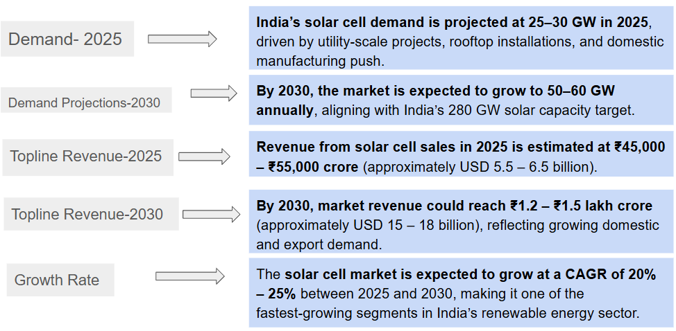 - Top Players: Waaree, Tata Power Solar, Adani Solar, Reliance New Energy, and Emmvee lead the domestic market, with planned or operational cell capacities ranging from 2.5 GW to 10 GW.