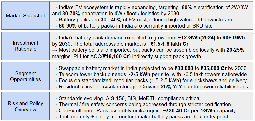 | Segment | Est. Demand (2030) | Pack Size | ₹/kWh Cost | Key Customers | Investor Angle |