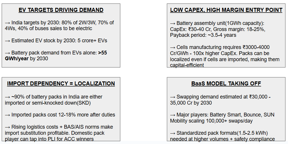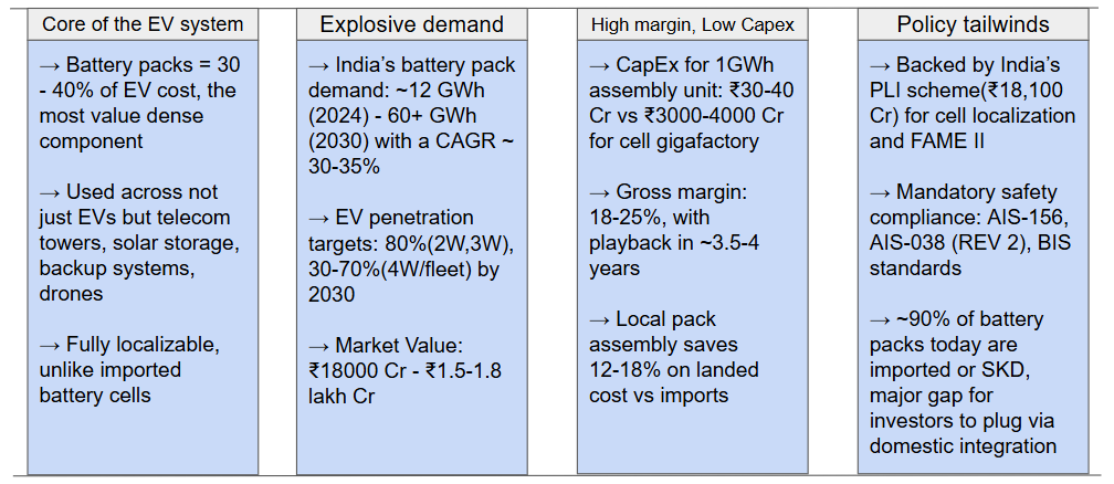 | 4W EVs / Fleets | 10–12 GWh | 15–30 kWh | Growth via fleets & urban delivery |