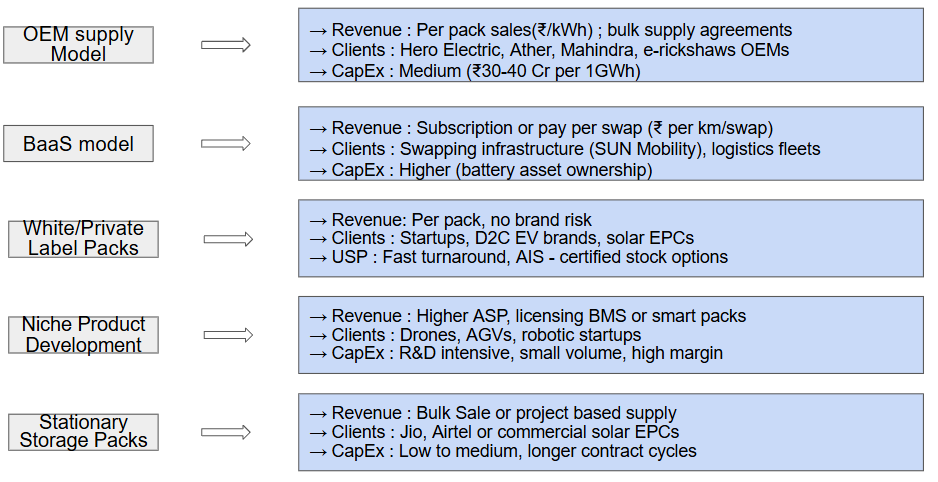 | Swapping / BaaS | 5–7 GWh (~10%) | 1.5–2.5 kWh | ₹10,000–₹11,500 | SUN Mobility, Battery Smart, Bounce | Recurring revenue, modular design advantage |