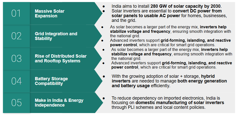 - India is expected to deploy 280 GW of solar by 2030, with inverter demand projected to reach 50–60 GW/year by 2030.