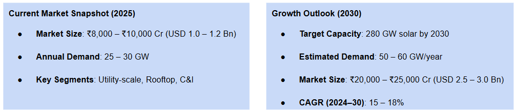 - Rapid domestic demand growth (expected to cross 50–60 GW/year by 2030)