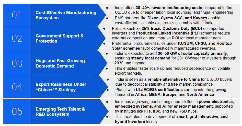 Based on the successful examples of players like Sineng, Sungrow, FIMER, and Hitachi Hi-Rel, it is clear that India offers a robust and fast-growing ecosystem for solar inverter manufacturing, supported by: