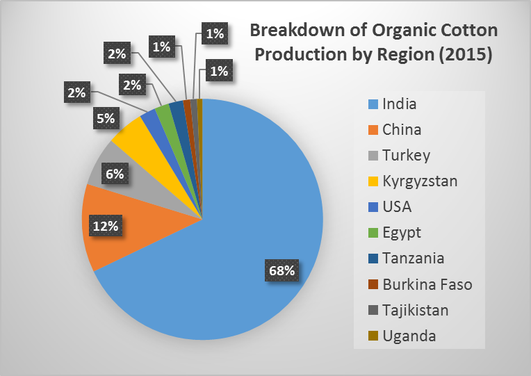 Nineteen countries worldwide produced organic cotton in 2015-16 producing 116,974 metric tons (MT), with the top five producing countries accounting for 96% of total production. India alone produced 74%, followed by, China, Turkey, Kyrgyzstan, and the U.S.